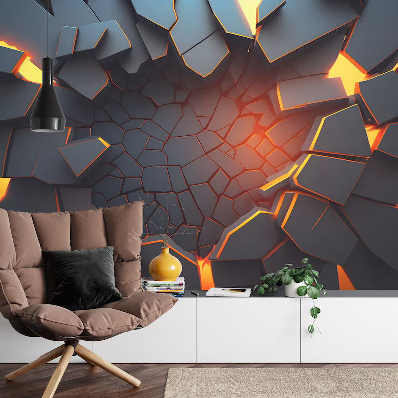 3D Abstract Broken Wall Mural, Black Geometric Wallpaper, Peel and Stick