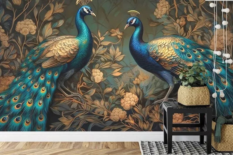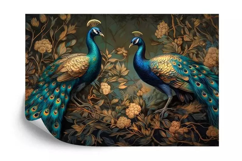 Abstract Peacocks Gold and Green Leaves Gift, Art Print Photomural Wallpaper Mural Easy-Install Removeable Peel and Stick Large Wall Decal