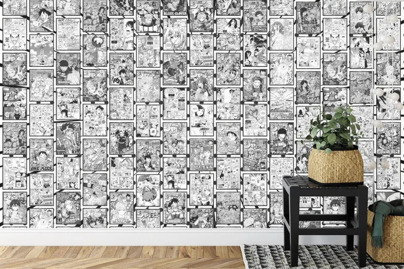 Anime Manga Collage Wallpaper, Black and White, Washable, Removable