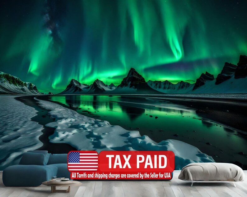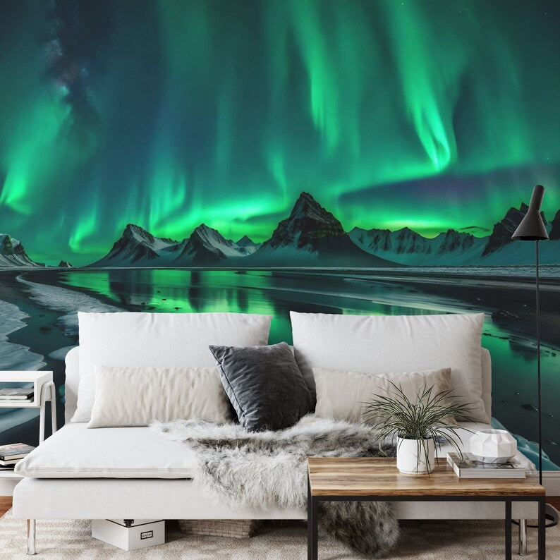 Aurora Borealis Wall Mural, Snowy Mountain Landscape
