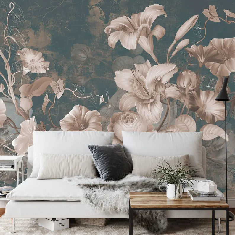 Baroque Floral Wallpaper Mural, Aged Concrete Grunge Art