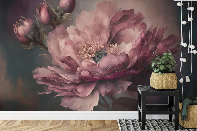 Baroque Peony Flower Wall Mural, Rich Deep Colors, Removable Wallpaper