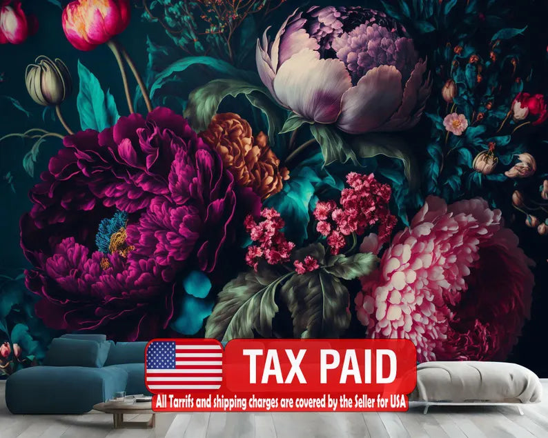 Baroque Peony Wallpaper Mural, Rich Deep Colors, Peel and Stick Art Print
