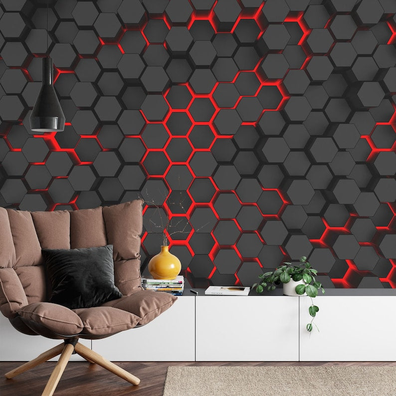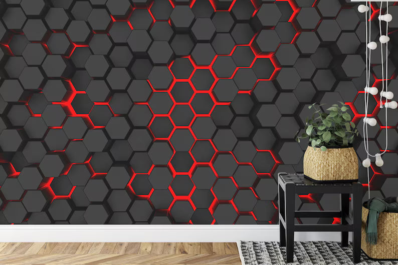 Black and Red Hexagon Geometric Wallpaper Mural, Peel and Stick