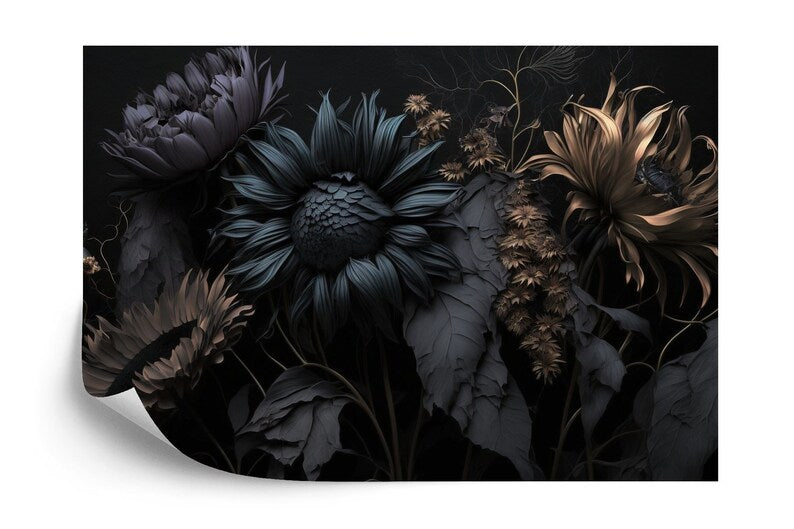 Black Floral Wallpaper Mural, Blooming Flowers, Peel and Stick Wall Decal