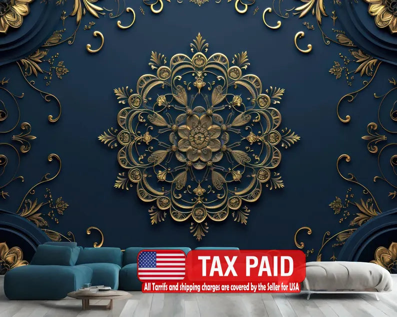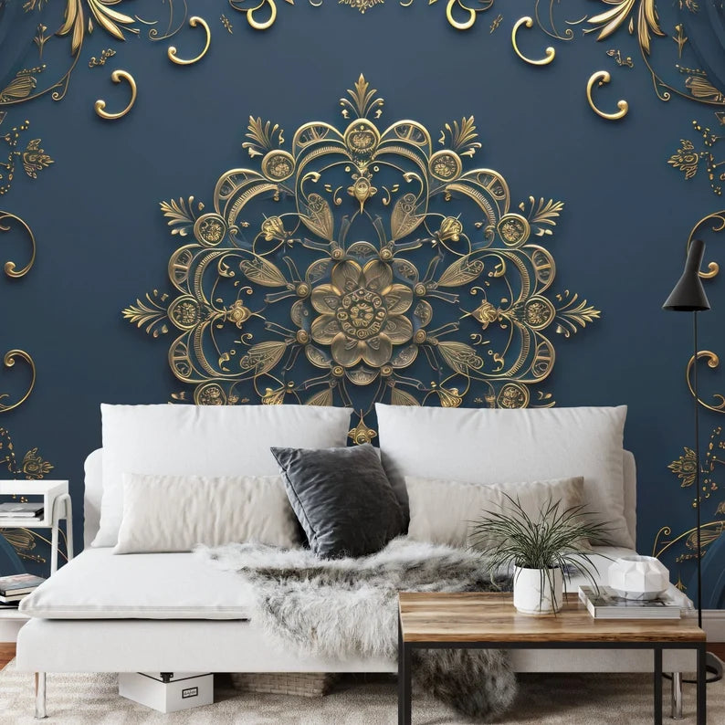 Blue and Gold Mandala Wallpaper, 3D Ceiling Decal (Peel & Stick)