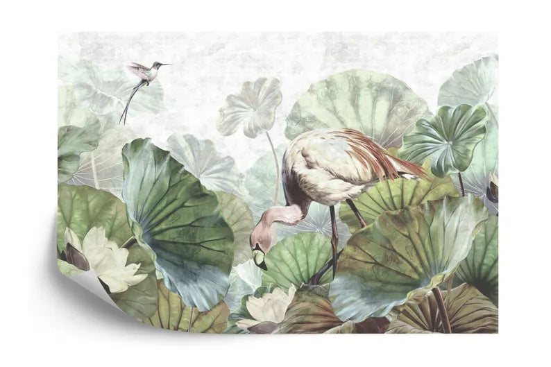 Botanical Flamingo Wallpaper Mural – Lotus Flowers, Hummingbird Art Print