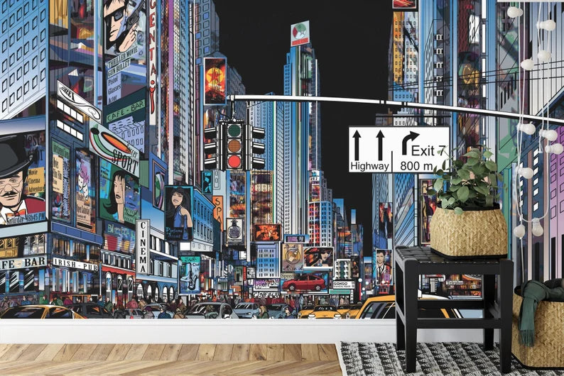 Cartoon Cityscape Wallpaper Mural, Colorful Comic Style (Peel & Stick)