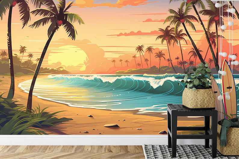 Cartoon Surfboard Beach Wallpaper Mural, Peel and Stick