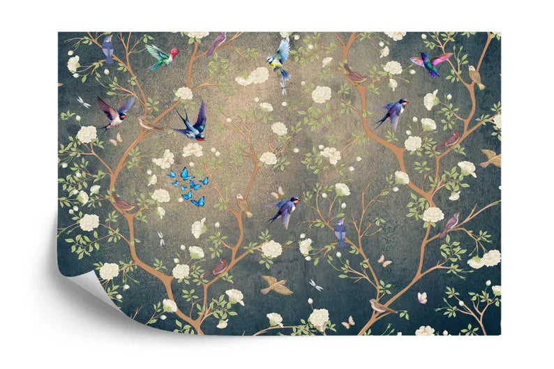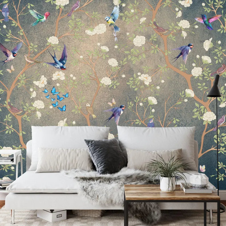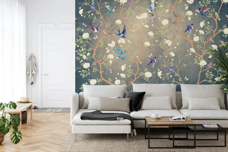 Chinoiserie Flowers Birds Wallpaper Mural, Vintage Art Print, Peel and Stick