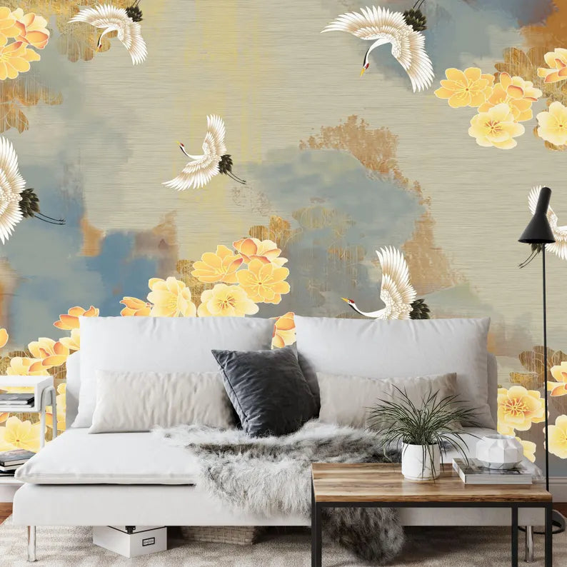 Chinoiserie Flying Cranes Wallpaper Mural, Vintage Aged Flowers, Peel and Stick Decal
