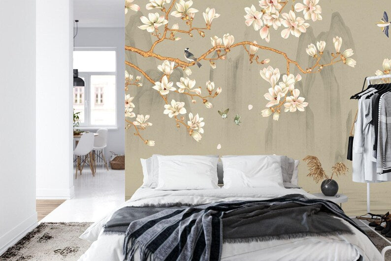 Chinoiserie Wallpaper Birds and Blossom Flowers Mural, Peel and Stick Decal