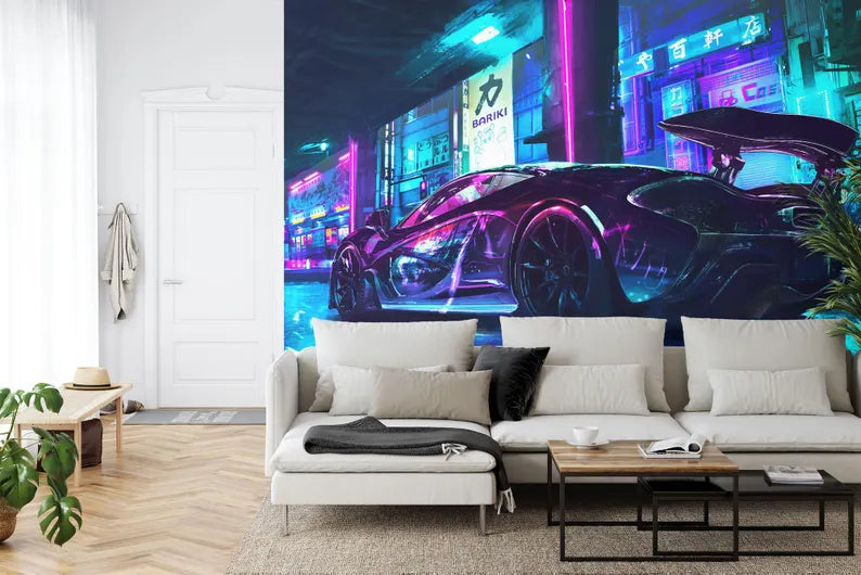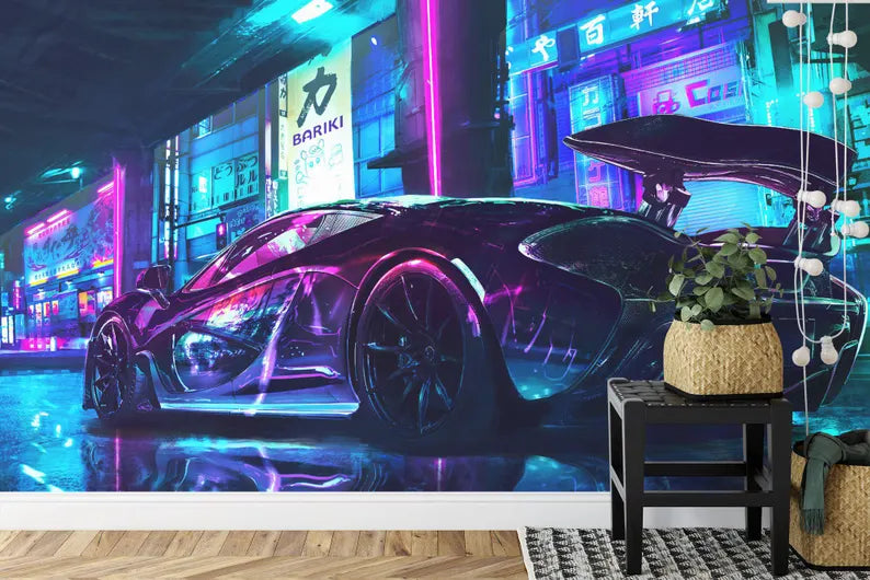 Cyberpunk Speed Car Wall Mural, Boys Room Peel and Stick Wallpaper