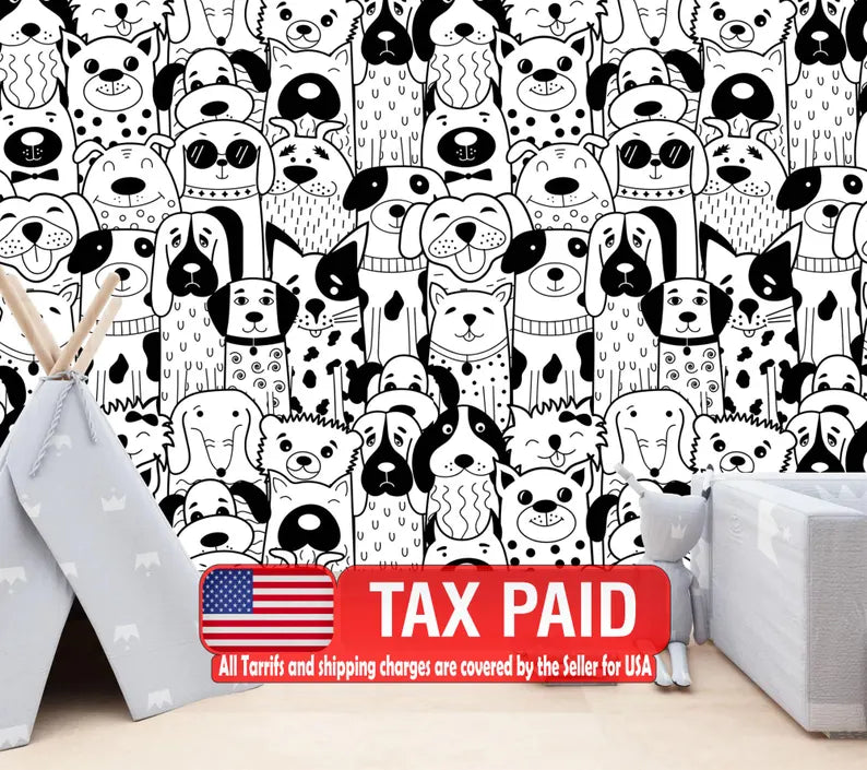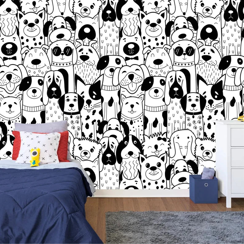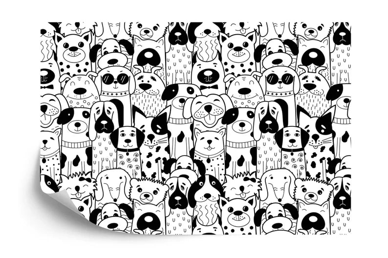 Doodle Dogs Wallpaper Mural, Black and White Art Print, Peel and Stick Decal