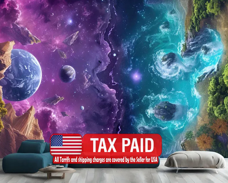 Earth Meets Space Wallpaper Mural, Colorful AI Art, Peel and Stick Decal