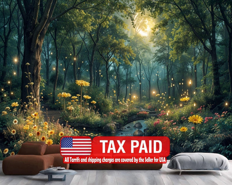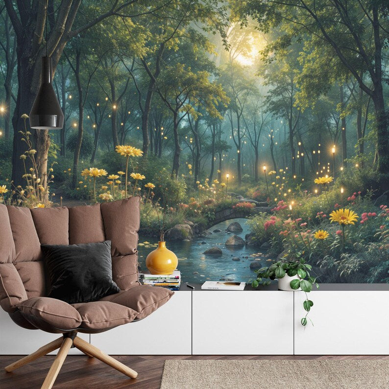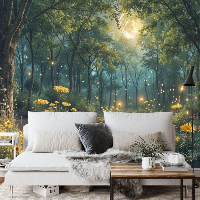 Enchanted Forest Night Wallpaper Mural, Moonlit Trees, Peel and Stick Wall Decal