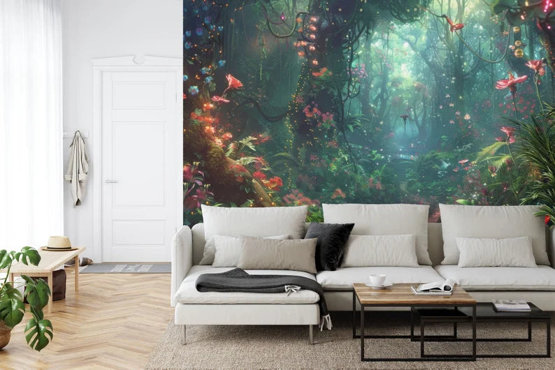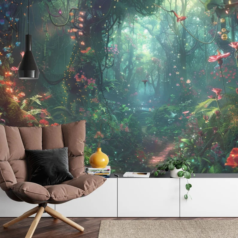 Enchanted Forest Wallpaper Mural, Glowing Flowers, Easy Install Peel and Stick