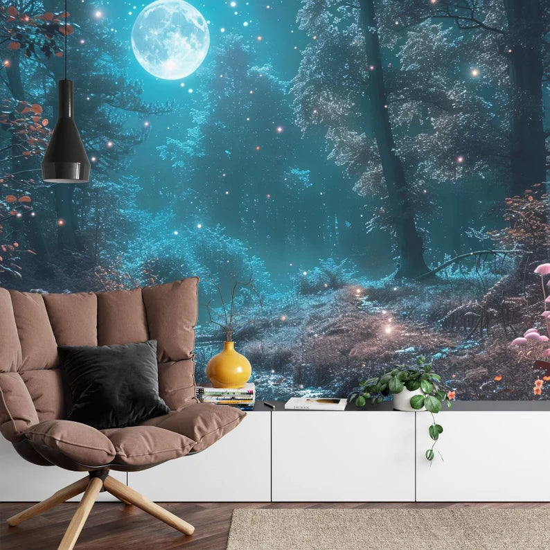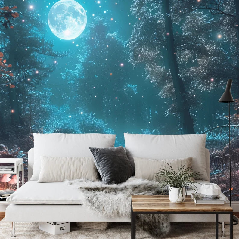 Enchanted Forest Wallpaper Mural, Moonlight Scene, Peel and Stick Wall Decal