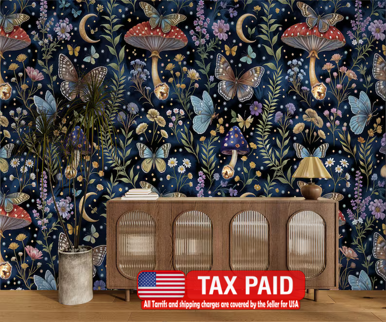 Wallpaper Enchanted Mushrooms Whimsical Butterflies, Flowers Gift, Art Print Mural Easy-Install Removeable Peel and Stick Large Decal