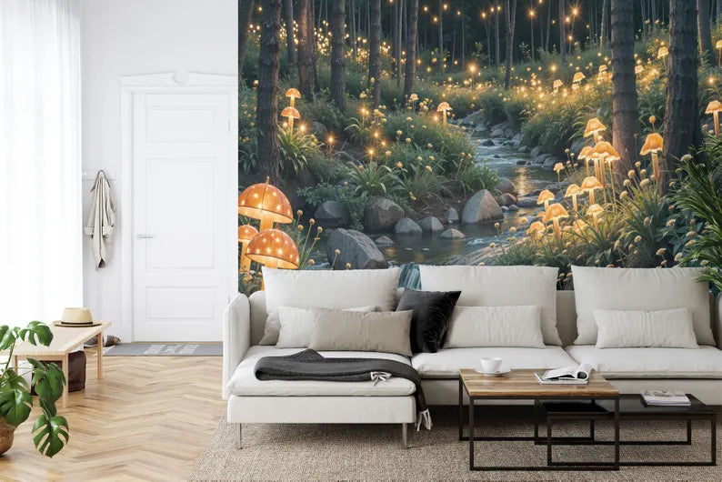 Fairytale Forest Wallpaper Mural, Magical Mushroom Lights, Peel and Stick