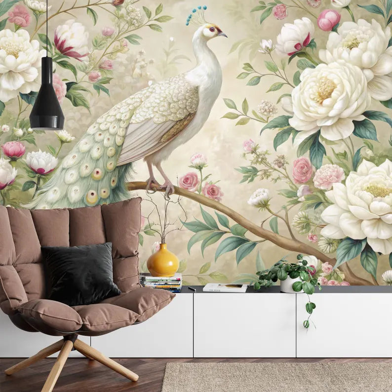 White Peacock Wallpaper Mural, Floral Garland, Peel and Stick Decal
