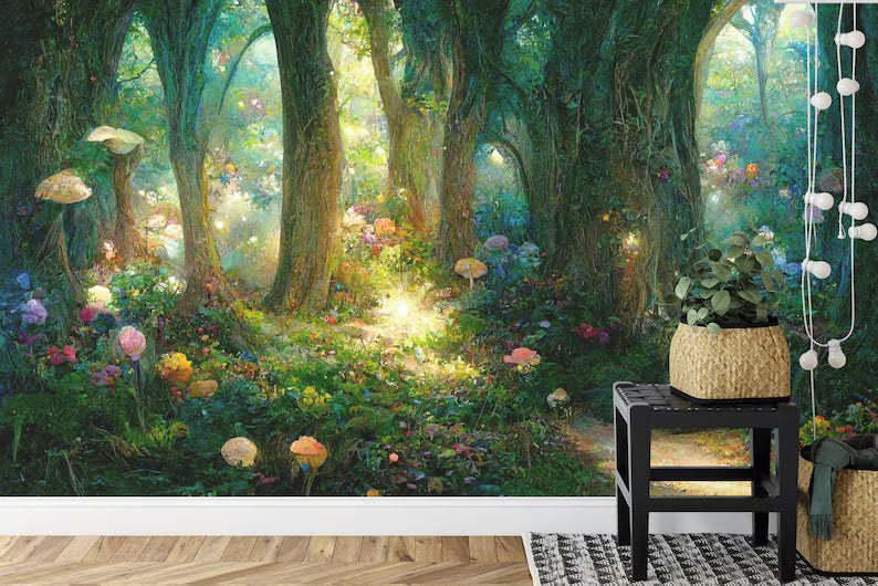 Fairytale Forest Wallpaper Mural, Magical Night Scene, Peel and Stick Decal