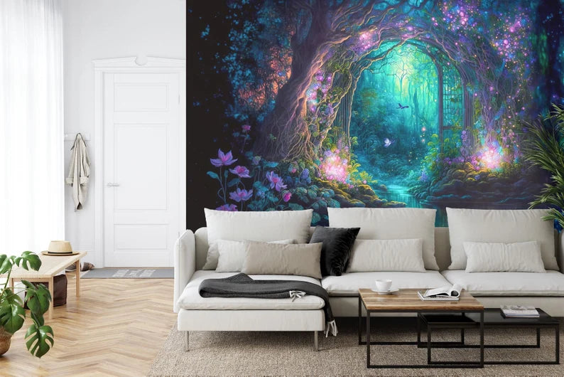 Fantasy Forest Wallpaper Mural, Purple Cyan