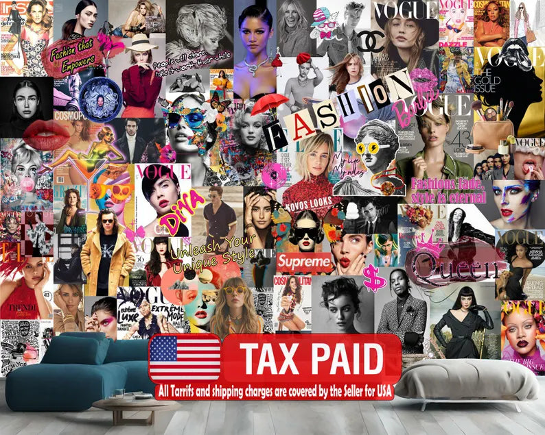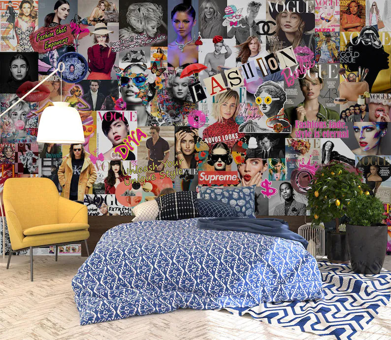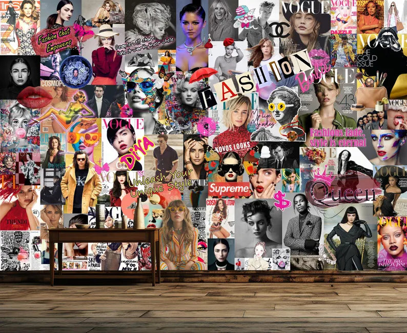 Fashion Collage Wallpaper Mural, Girly Room Decor, Peel and Stick
