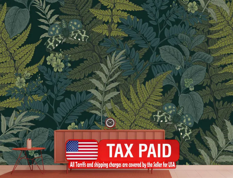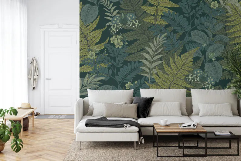 Fern Leaves and Butterflies Wallpaper Mural, Peel and Stick Decal