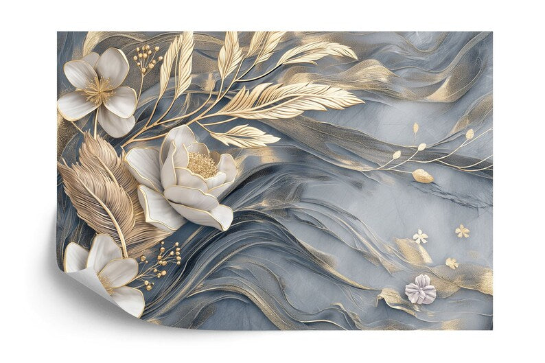 Floral Wallpaper Mural, Marble and Feathers Design, Peel and Stick