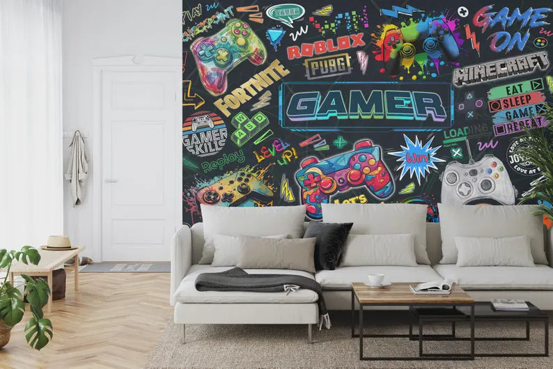 Gaming Room Wallpaper Mural, Peel and Stick Wall Decal, Kids Room Decor. Removeable