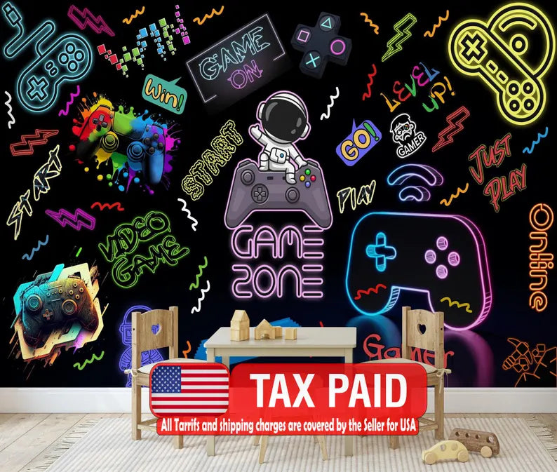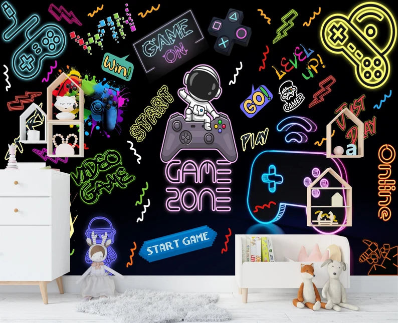 Gaming Room Wallpaper Mural, Neon Gamepad Design, Peel and Stick Decal