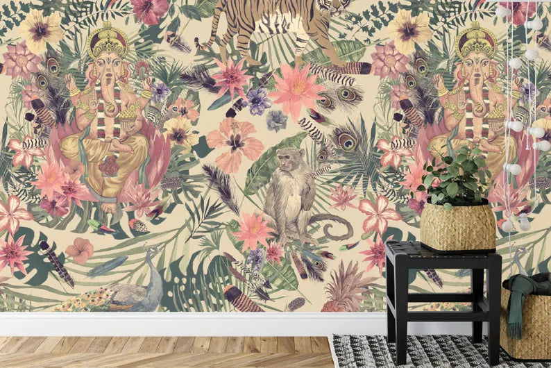 Ganesha Tiger Floral Wallpaper Mural, Peel and Stick Decal