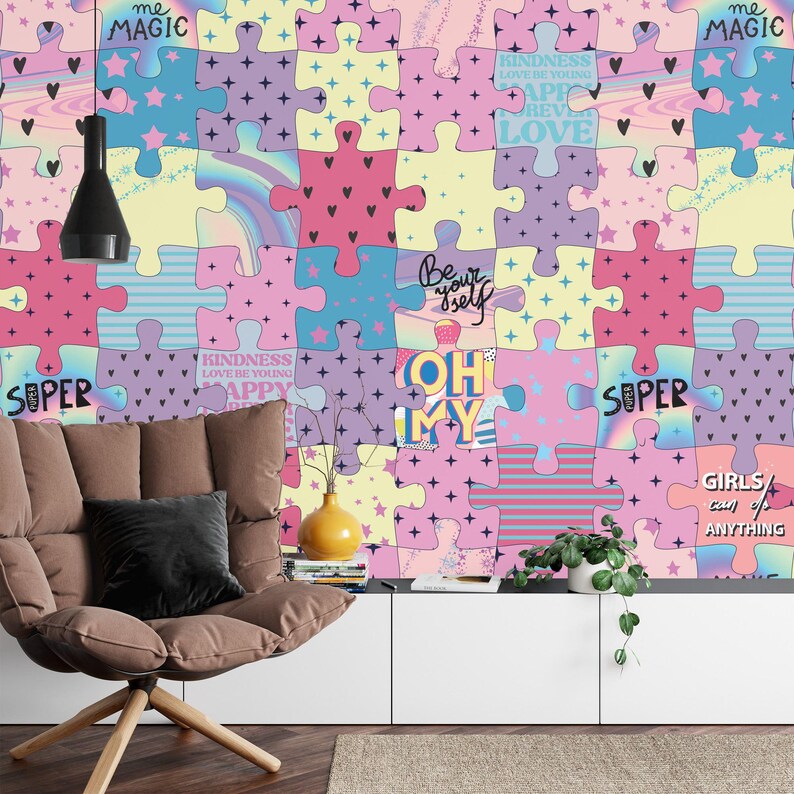Girls Room Puzzle Wall Mural, Colorful Wallpaper