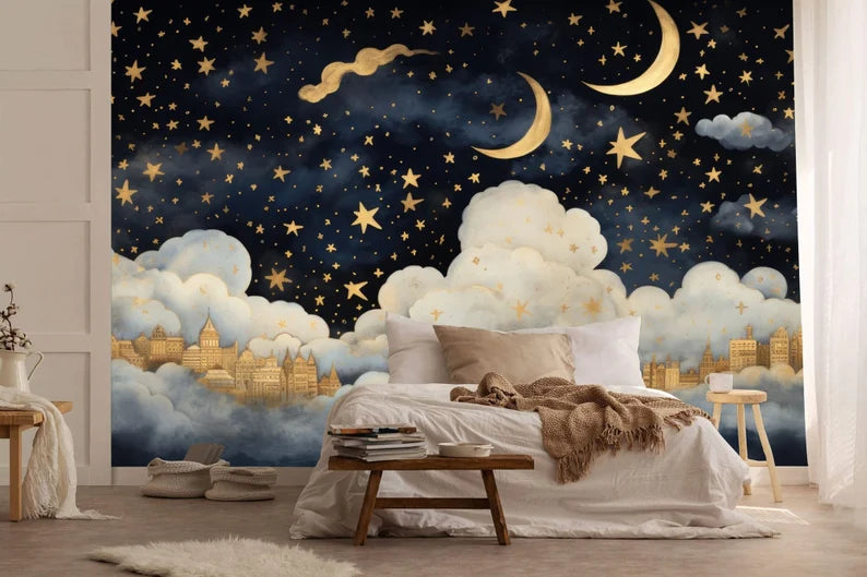 Gold Starry Night Sky Wallpaper Mural, Peel and Stick Decal