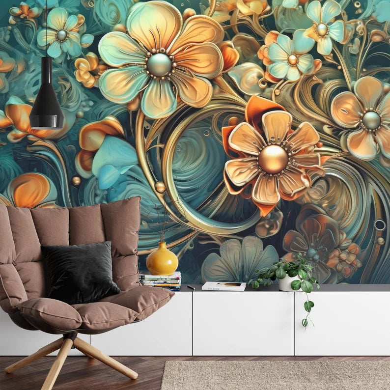Golden Floral Wall Mural, 3D Metallic Flower Wallpaper (Peel and Stick)