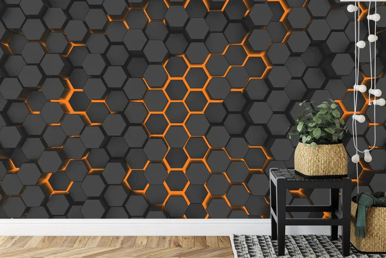 Hexagon Wall Mural | Dark Geometric, Orange Lights (Peel & Stick)