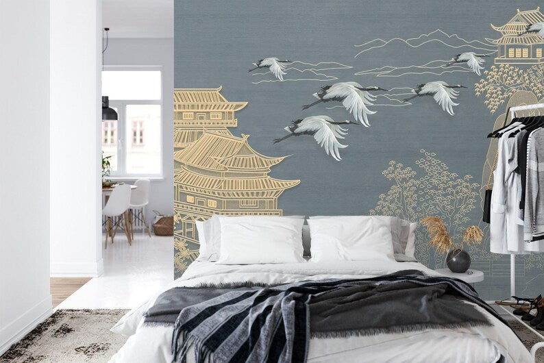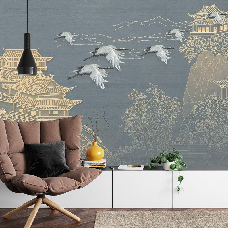 Japanese Chinoiserie Flying Cranes Wallpaper Mural, Peel and Stick