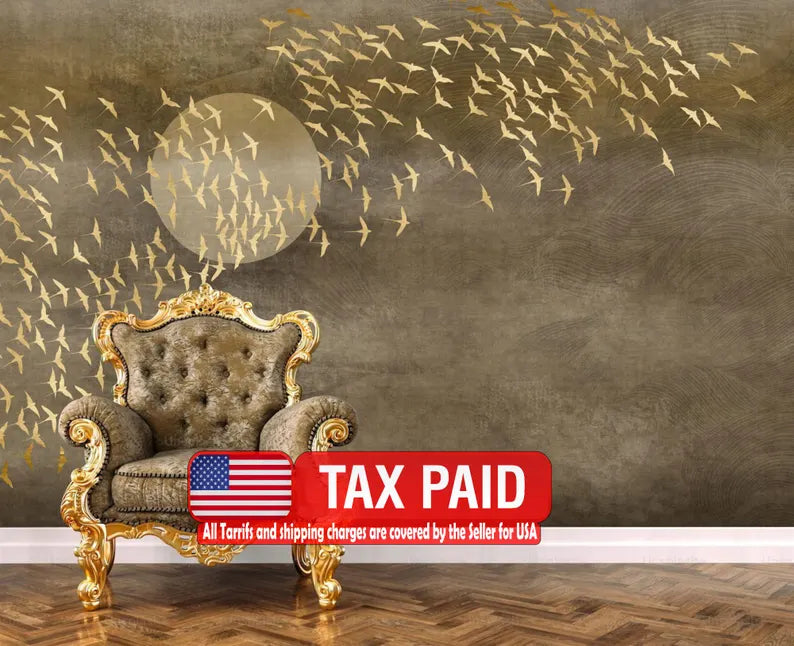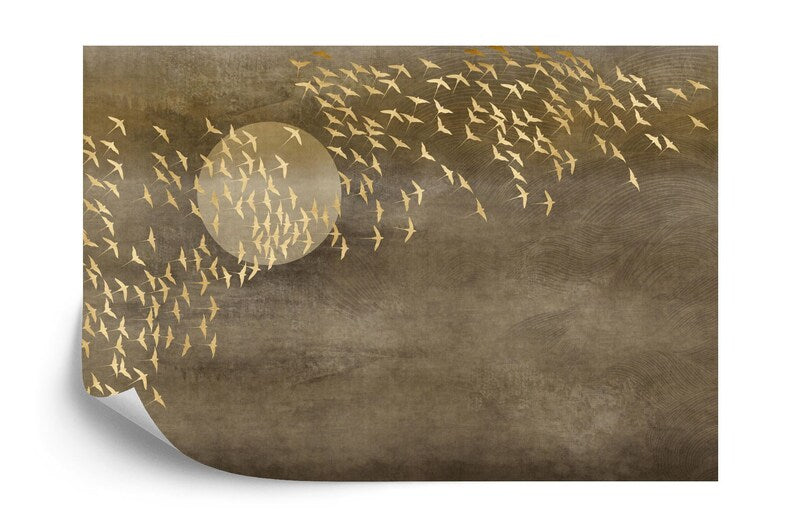 Japanese Gold Birds Wallpaper Mural, Peel and Stick Wall Decal