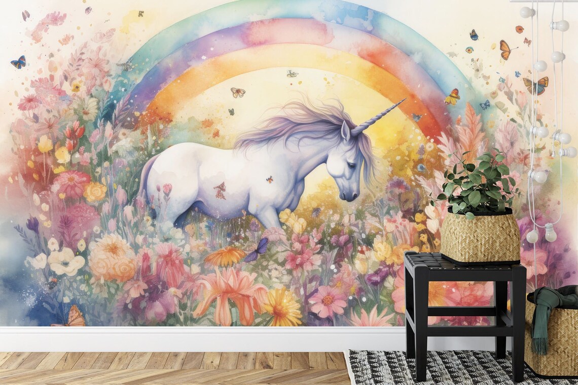 Magical Unicorn in field of flowers, butterfly, AI, Girls Room Decor Easy-Install Wall Mural Wallpaper Peel and Stick Modern Art Washable