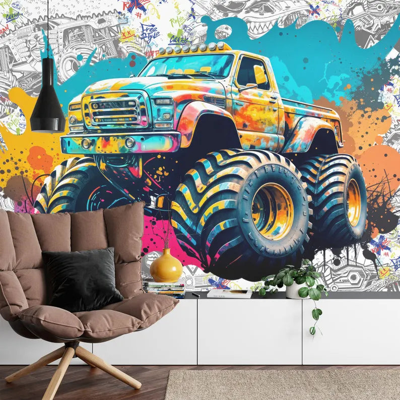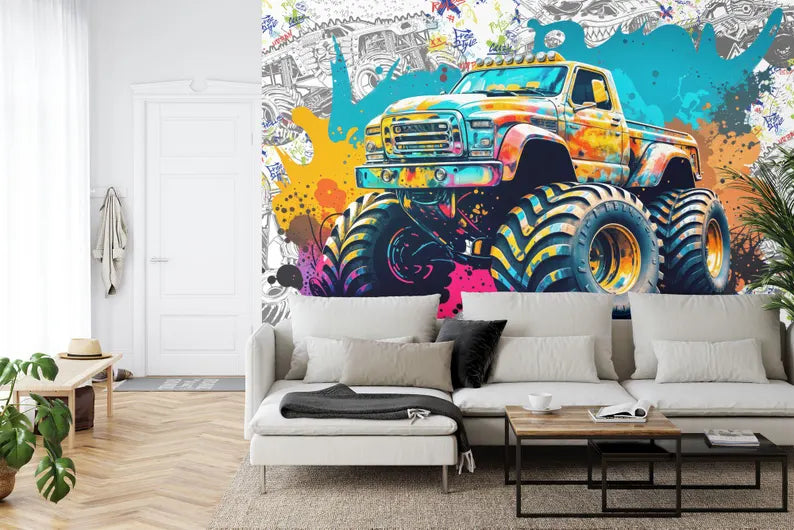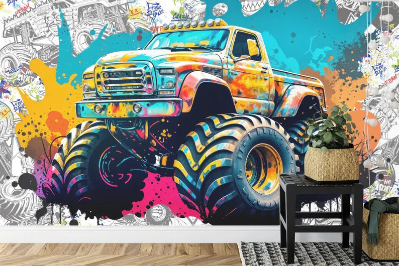 Monster Truck Watercolor Mural, Kids Room Decor, Peel and Stick Decal