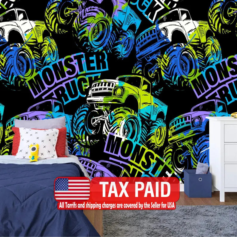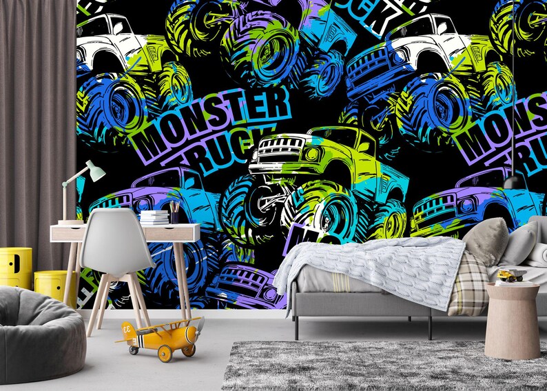 Monster Truck Watercolor Wallpaper Mural, Kids Room Decor (Peel and Stick)