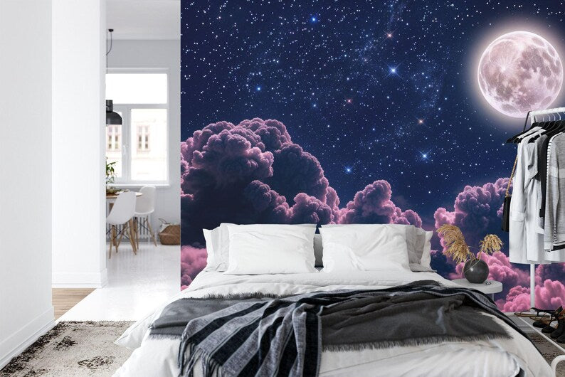 Moon & Stars Wallpaper Mural, Peel and Stick Galaxy Wall Art