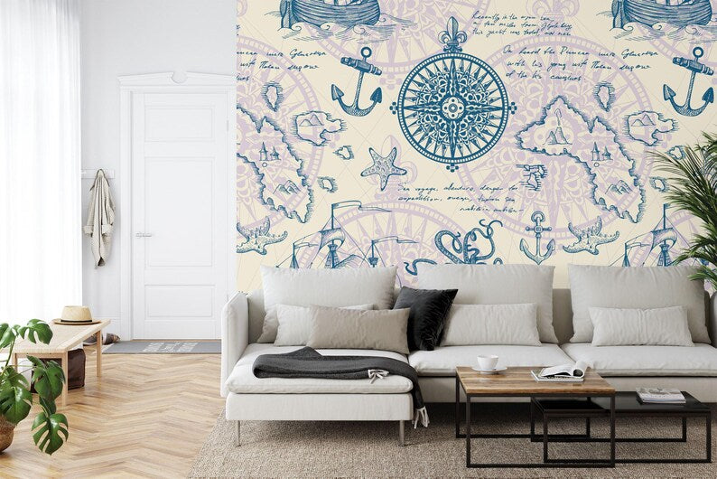 Nautical Map Mural, Vintage Captain's Log Wallpaper, Peel and Stick