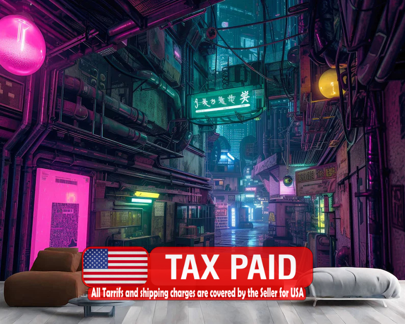 Neon Cyberpunk City Wallpaper Mural, Peel and Stick Wall Decal