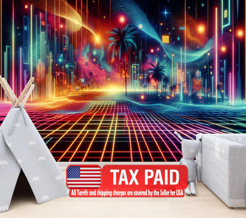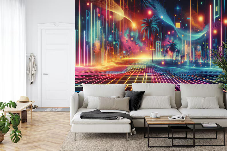 Neon Gaming Room Mural, 80s Vaporwave, Peel and Stick