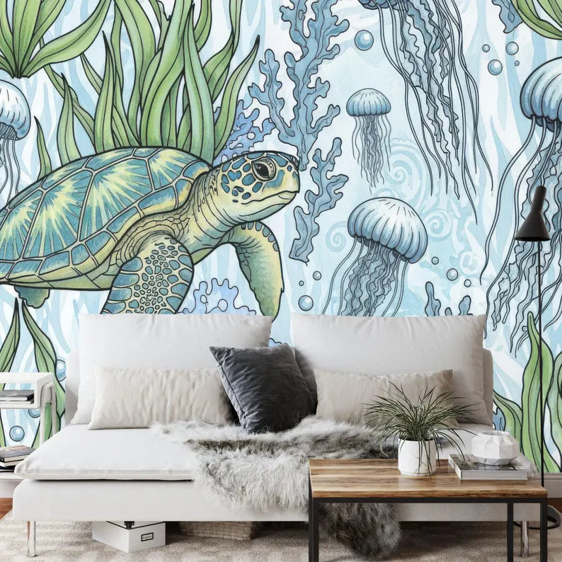 Ocean Turtle Jellyfish Wallpaper Mural, Removable Peel and Stick