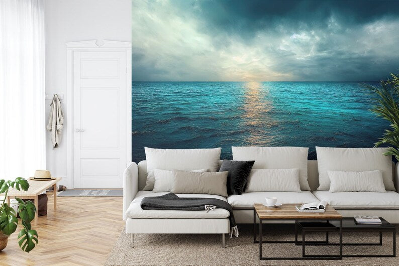 Ocean View Wall Mural, Calm Cloudy Seascape, Peel and Stick Wallpaper