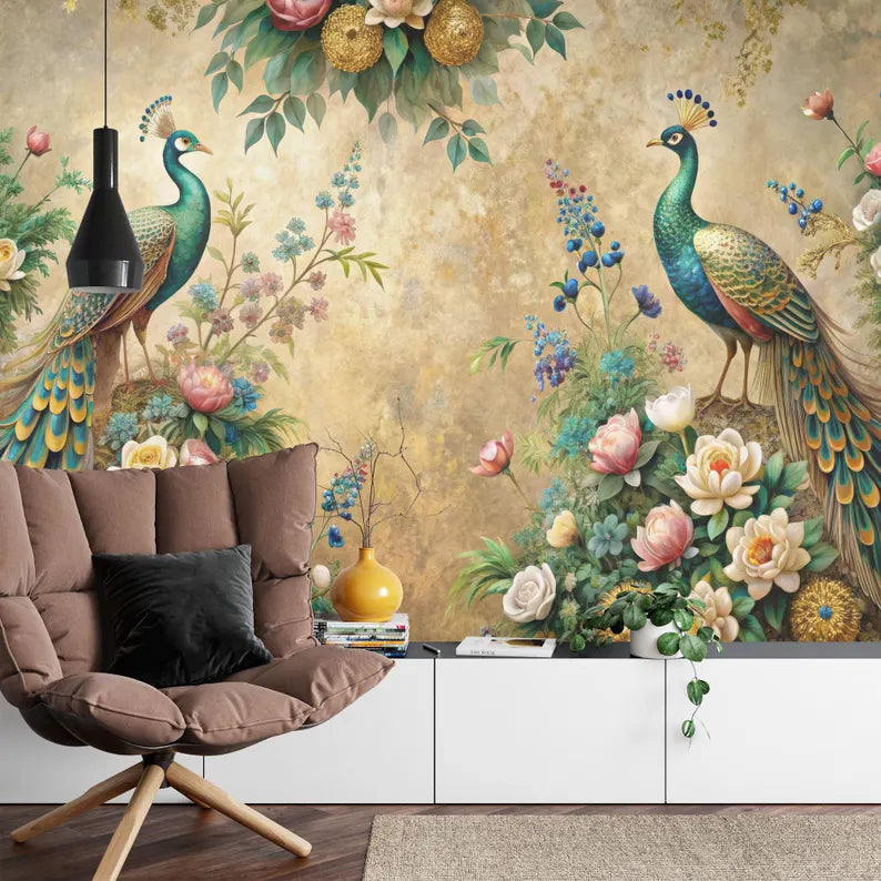 Peacock and Floral Garland Wall Mural, Removable Peel and Stick Wallpaper