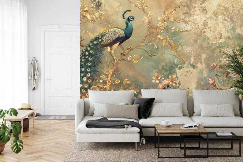 Peacock on Lively Busy Colorful Garland Gift, Art Print Photomural Wallpaper Mural Easy-Install Removeable Peel and Stick Large Wall Decal